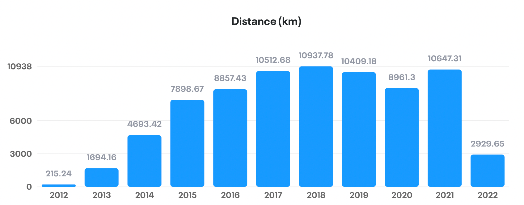 My 2022 total (so far!) is 2929.65 km. If I stay healthy, I should hit my 2022 target of 10,000 km. Here are my yearly totals since I started biking again in 2012.