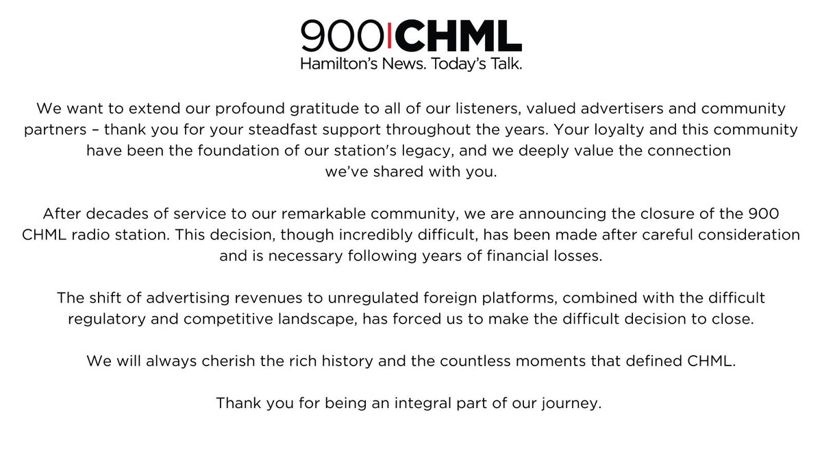 This decision, though incredibly difficult, has been made after careful consideration and is necessary following years of financial losses. The shift of advertising revenues to unregulated foreign platforms, combined with the difficult regulatory and competitive landscape, has forced us to make the difficult decision to close.