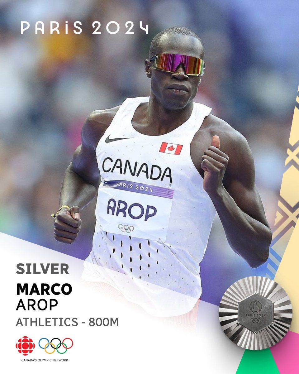 Marco Arop earned the Olympic silver medal in the men's 800-metres final in a Canadian-record time of one minute 41.20 seconds.