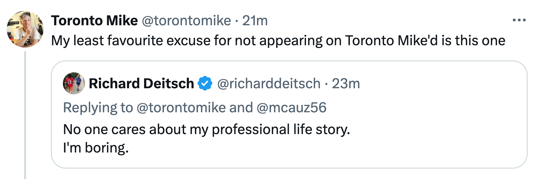 Saying no because you're "boring" suggests you think your years at Sports Illustrated, The Athletic and The Fan 590 would make for a boring story, and that I, as host, would be unable to mold an entertaining conversation from such a base. I'm calling bullshit.