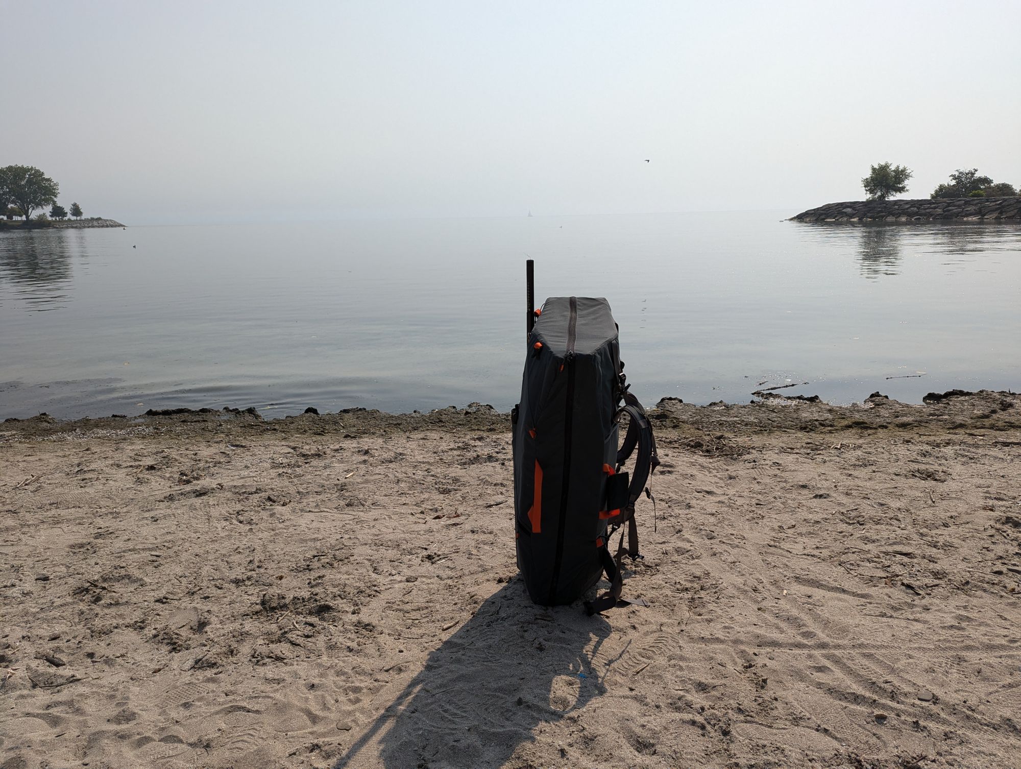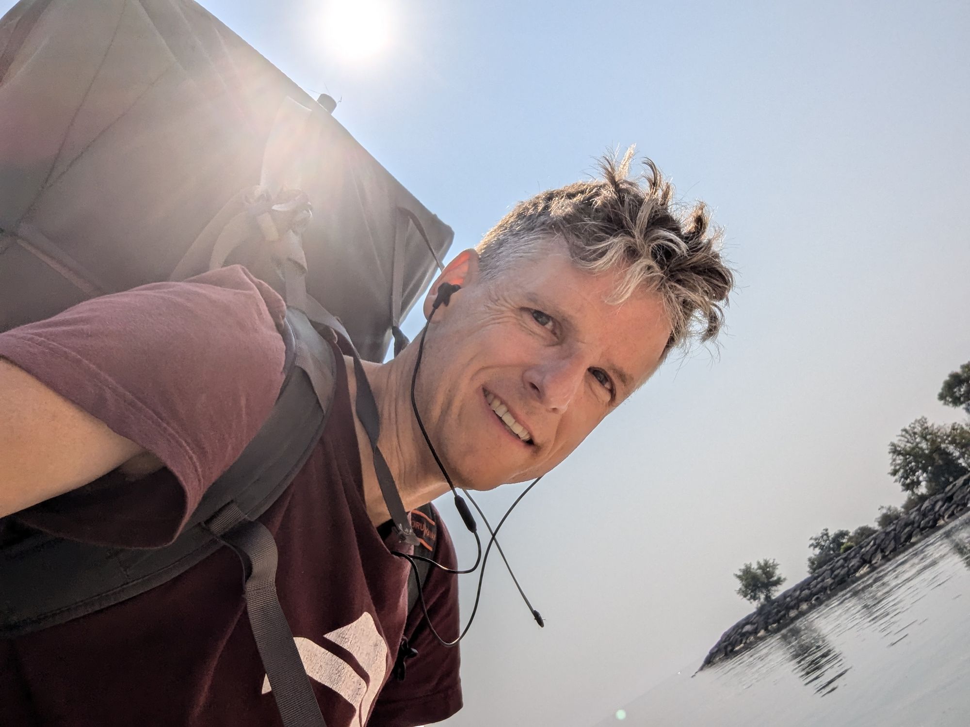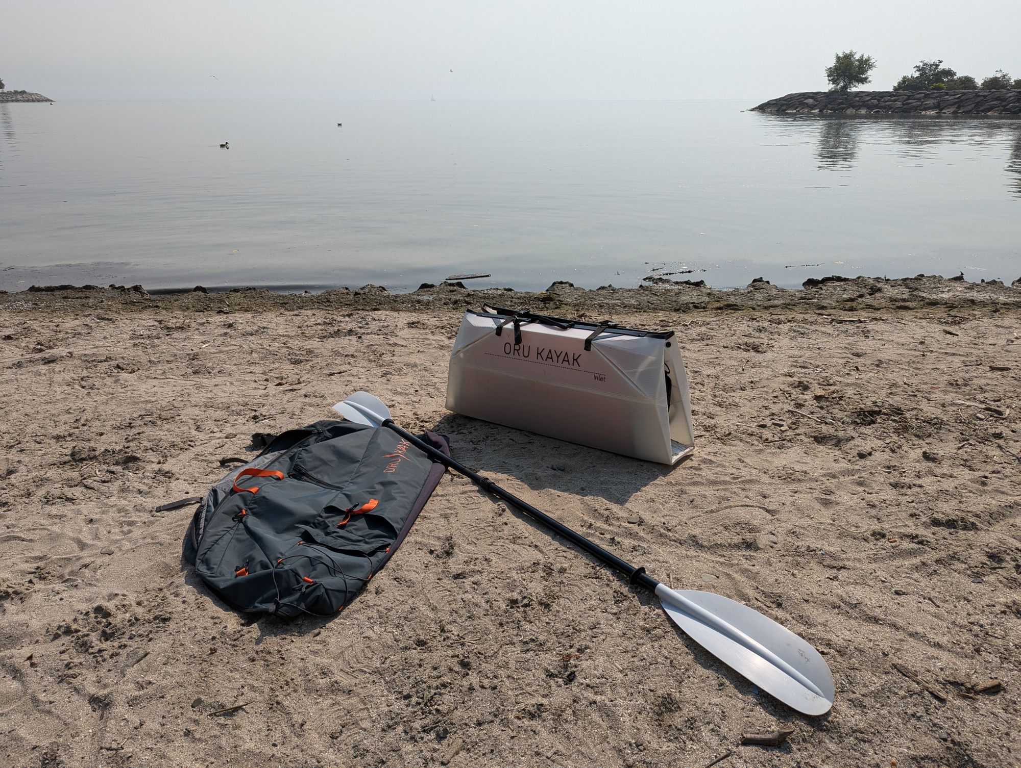 My kayak folds up and goes in a backpack that I wear on my bike while I bike to the water. I know that sounds wild, but it's 100% true. Here I am at the lake with my kayak on my back.
