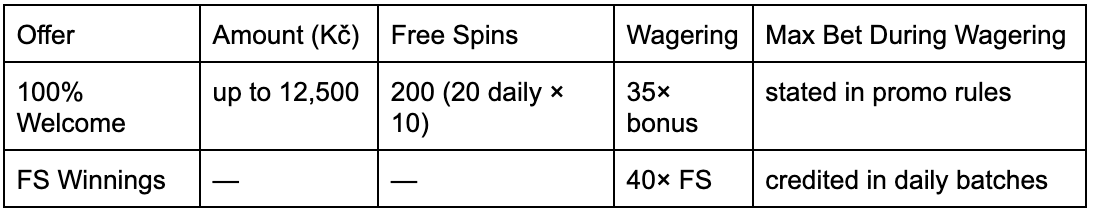 Boomerang Casino credits 100% up to 12,500 Kč plus 200 spins in daily portions, with 35× on the bonus and 40× on spin winnings, so pacing bets is simple at Boomerang Casino.