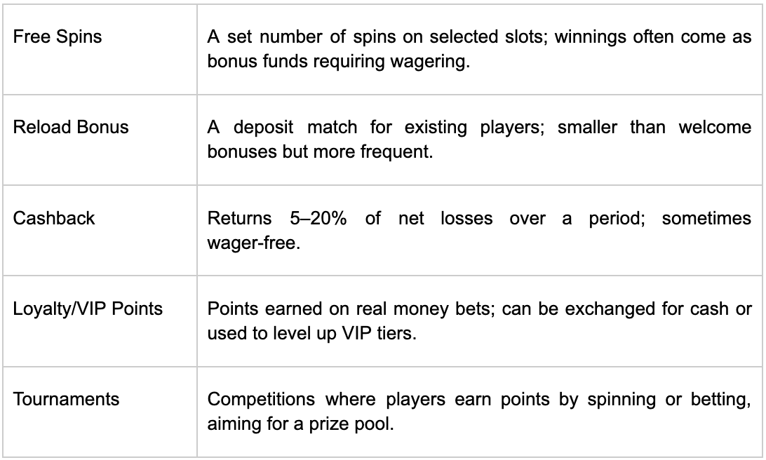 Bonuses and promo offers attract a lot of new players to online casinos. From welcome packages to cashback and VIP programs, there is always something to benefit from. In the table below, you can see a detailed breakdown of the bonus types you can frequently come across on a Canadian gambling website.